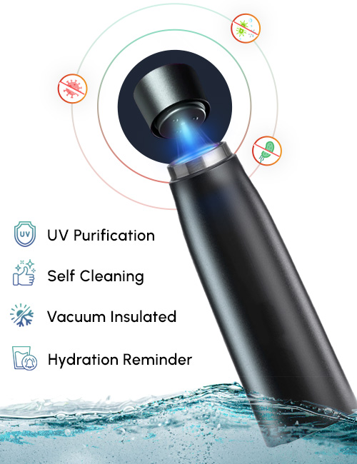 When the touch sensors activate the UV-C purification for 60 - 90 seconds, they eliminate bacteria, viruses, pathogens, germs & even foul odor - keeping both your water & bottle clean & pure!